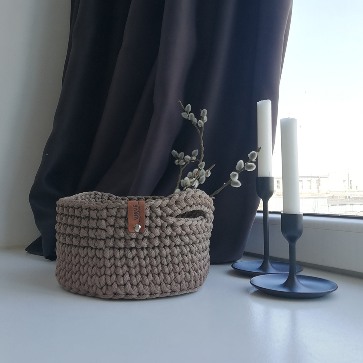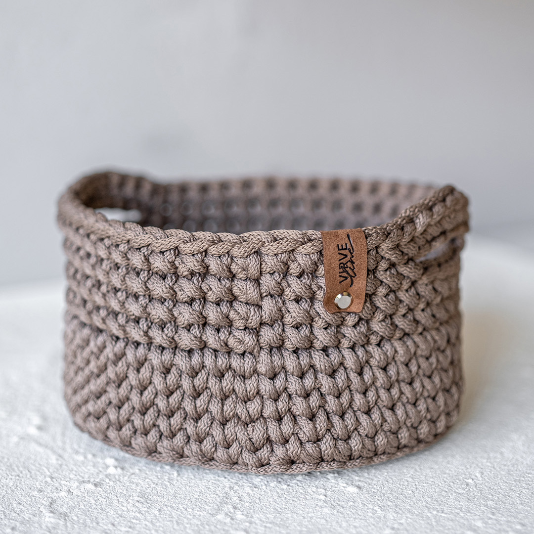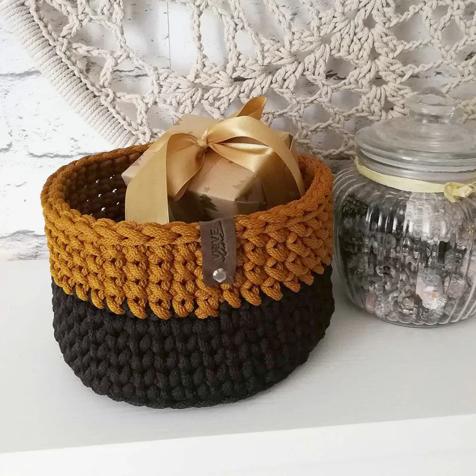 Rankų darbo nerta praktiška apvali dviejų raštų daiktadėžė, pagaminta iš tvirtos ir ilgaamžės poliesterio virvės.