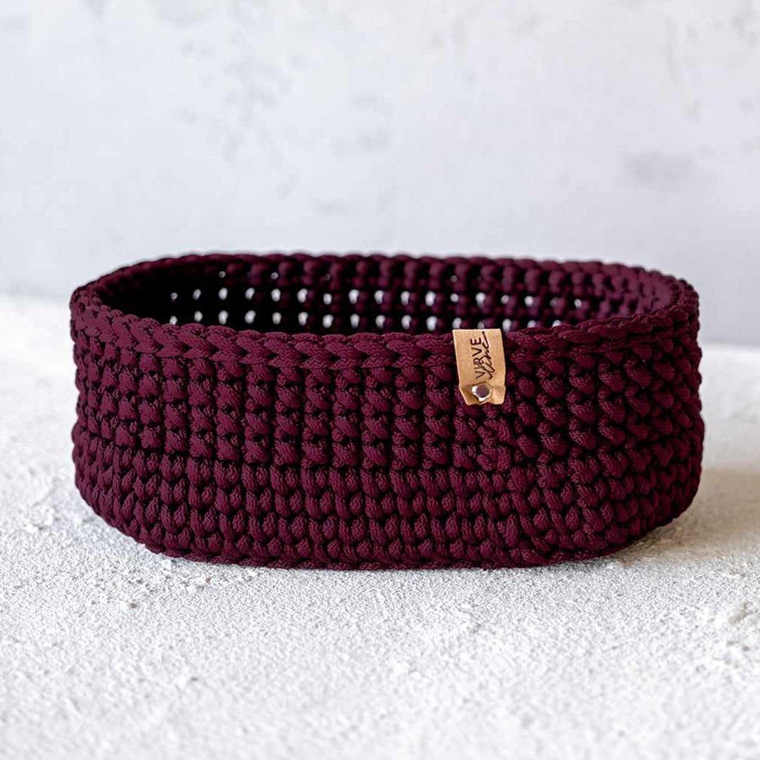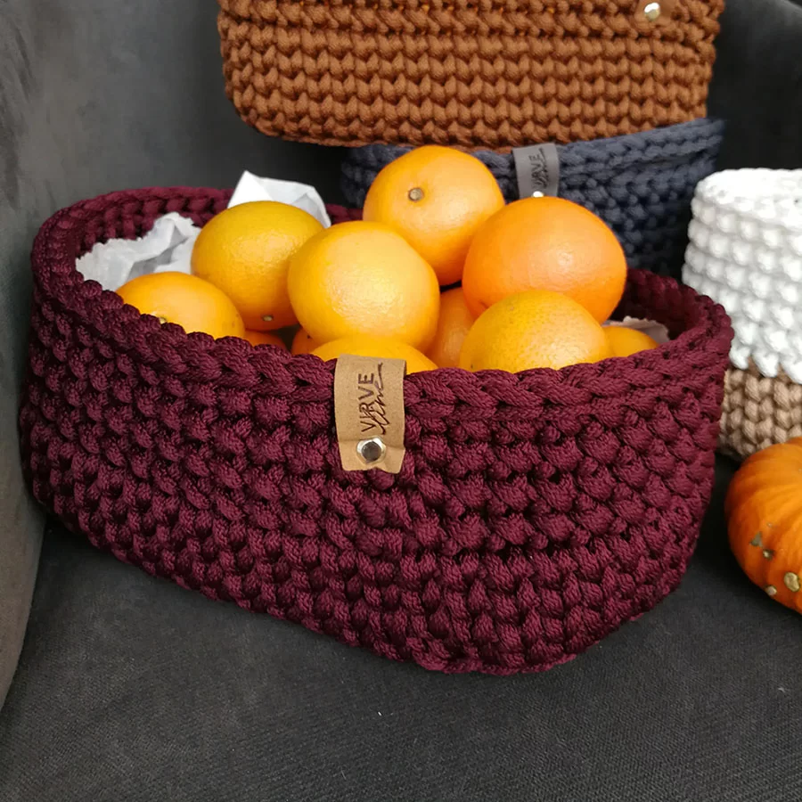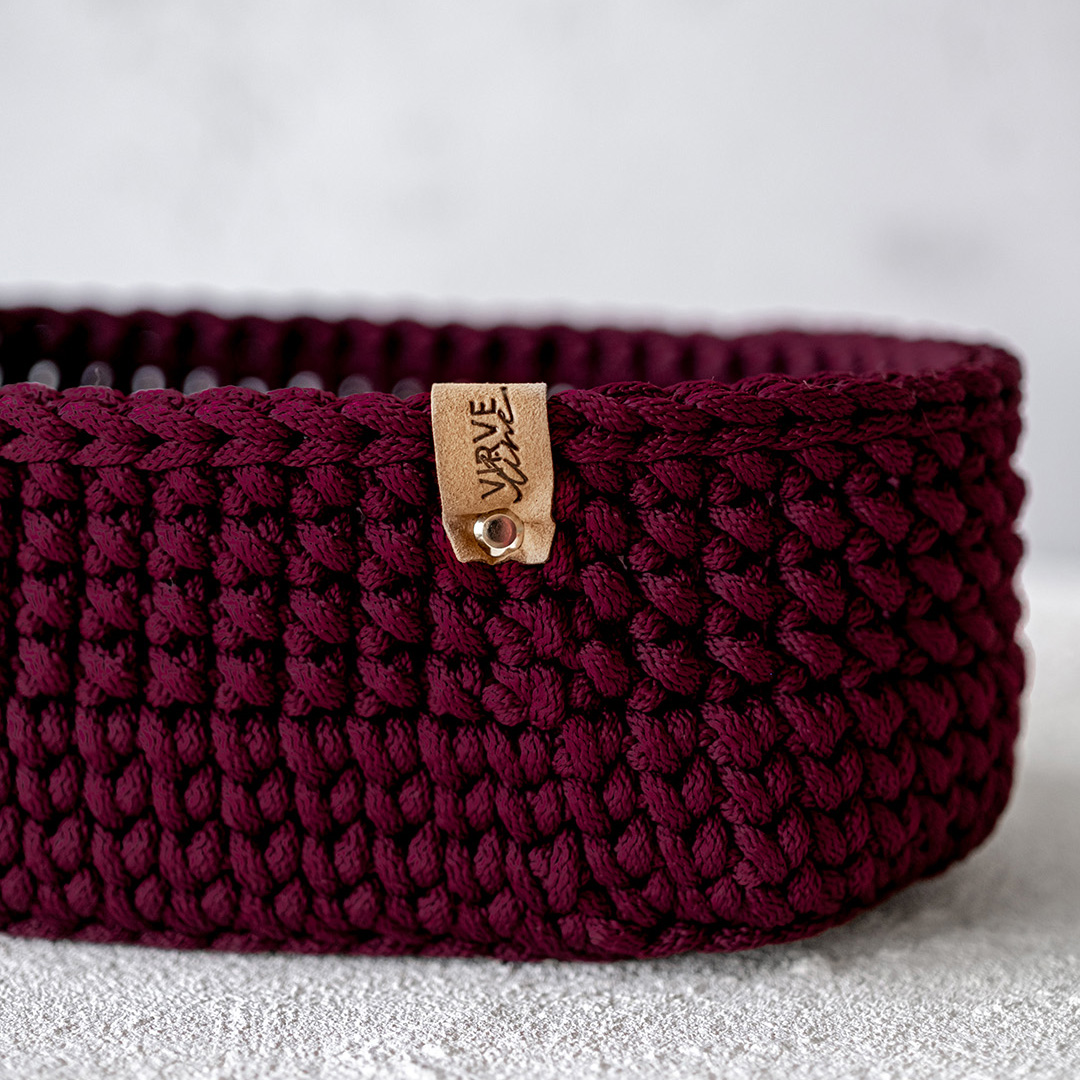 Rankų darbo nerta ovali daiktadėžė puikiai tinka tvarkingam daiktų laikymui – vonioje, vaikų kambaryje, svetainėje. Tvirto rašto apačia, kuri laiko formą, ir minkštesnio nėrimo viršutinė dalis, kuri prisitaiko prie talpinamų daiktų formų. Ilgaamžė, formą išlaikanti ir lengvai valoma.